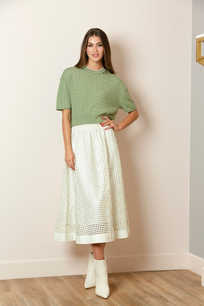 Perforated Pleather Gathered Midi Skirt with Elastic WB PU; Lining: 100% Polyester