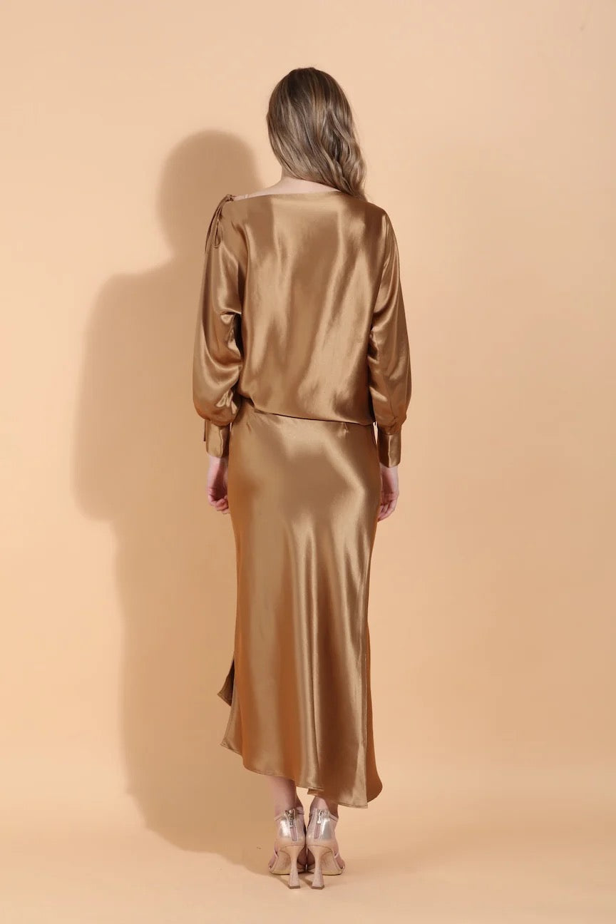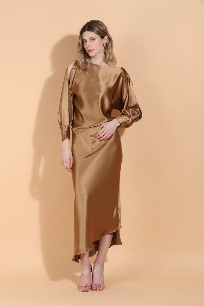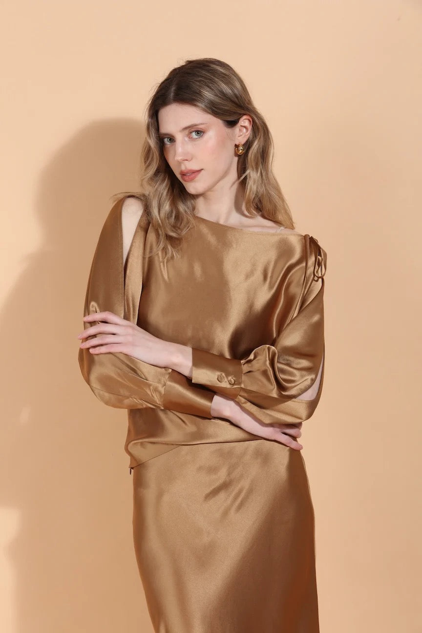 Boat Neck Satin Blouse w/ Split Sleeves