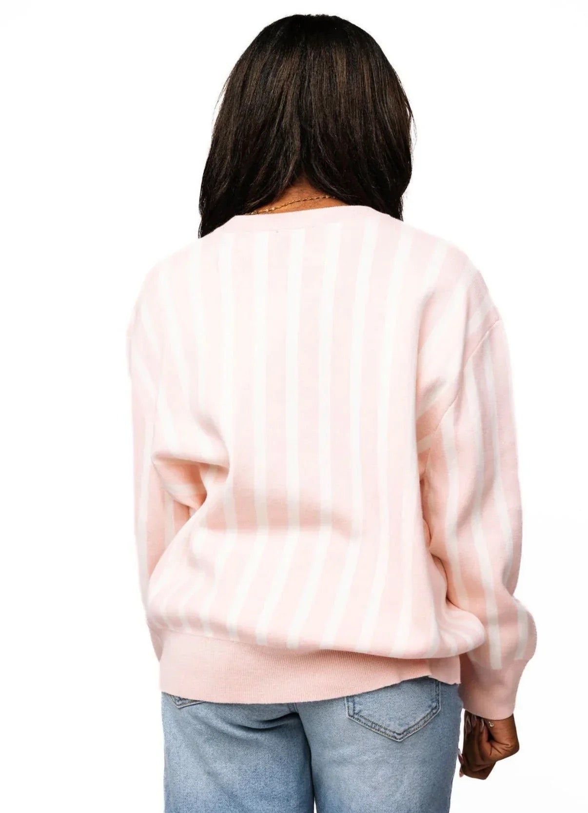 Sip in style with this playful striped sweater, which is equal parts chic and fun. Featuring light pink and white stripes paired with a sequin espresso martini design, it's the perfect pick for anyone who loves a little sparkle with their cocktail hour. The flirty sequin details catch the light beautifully, making this sweater a conversation starter whether you're out on the town or cozying up at home. Comfortable enough for everyday wear, bold enough to turn heads!