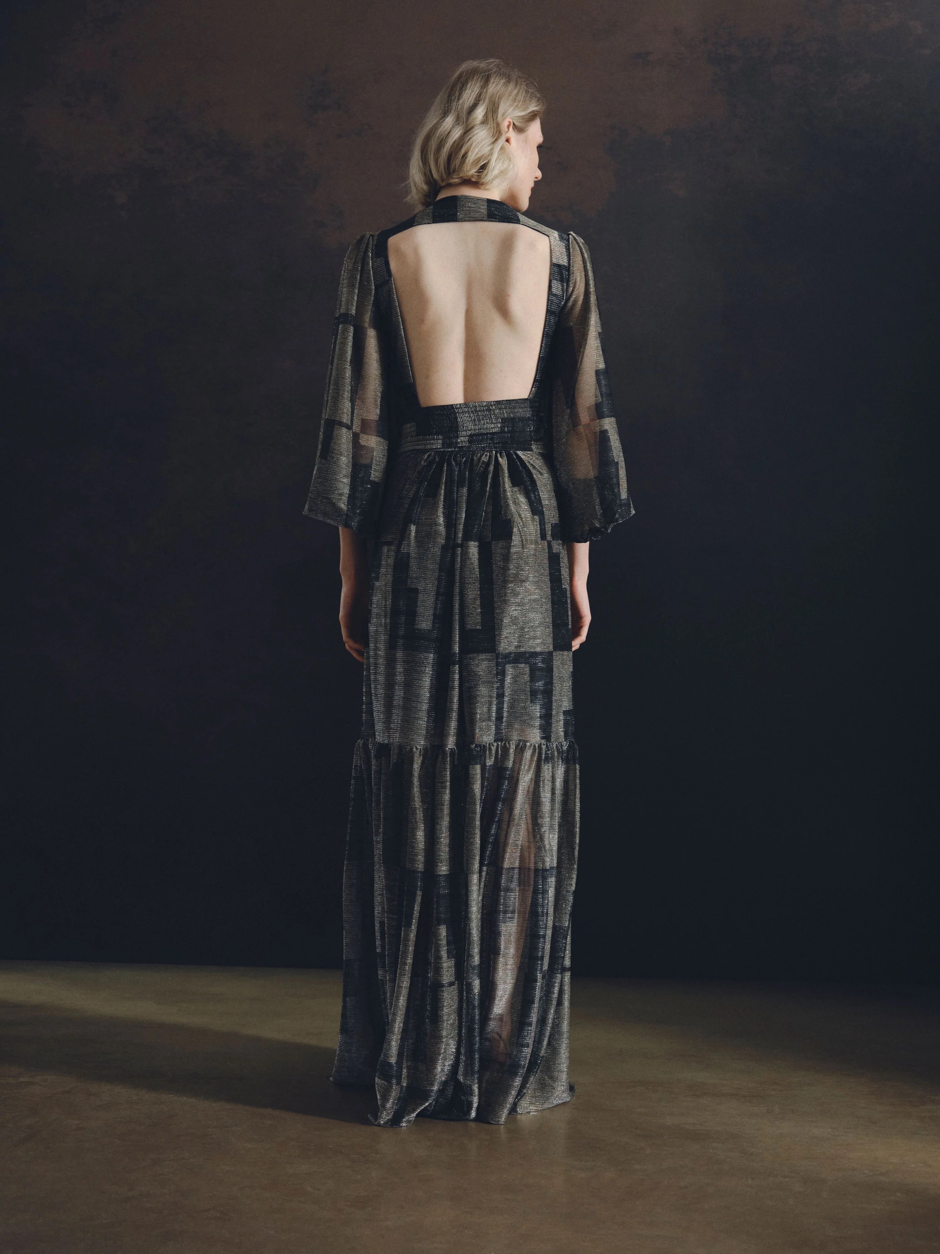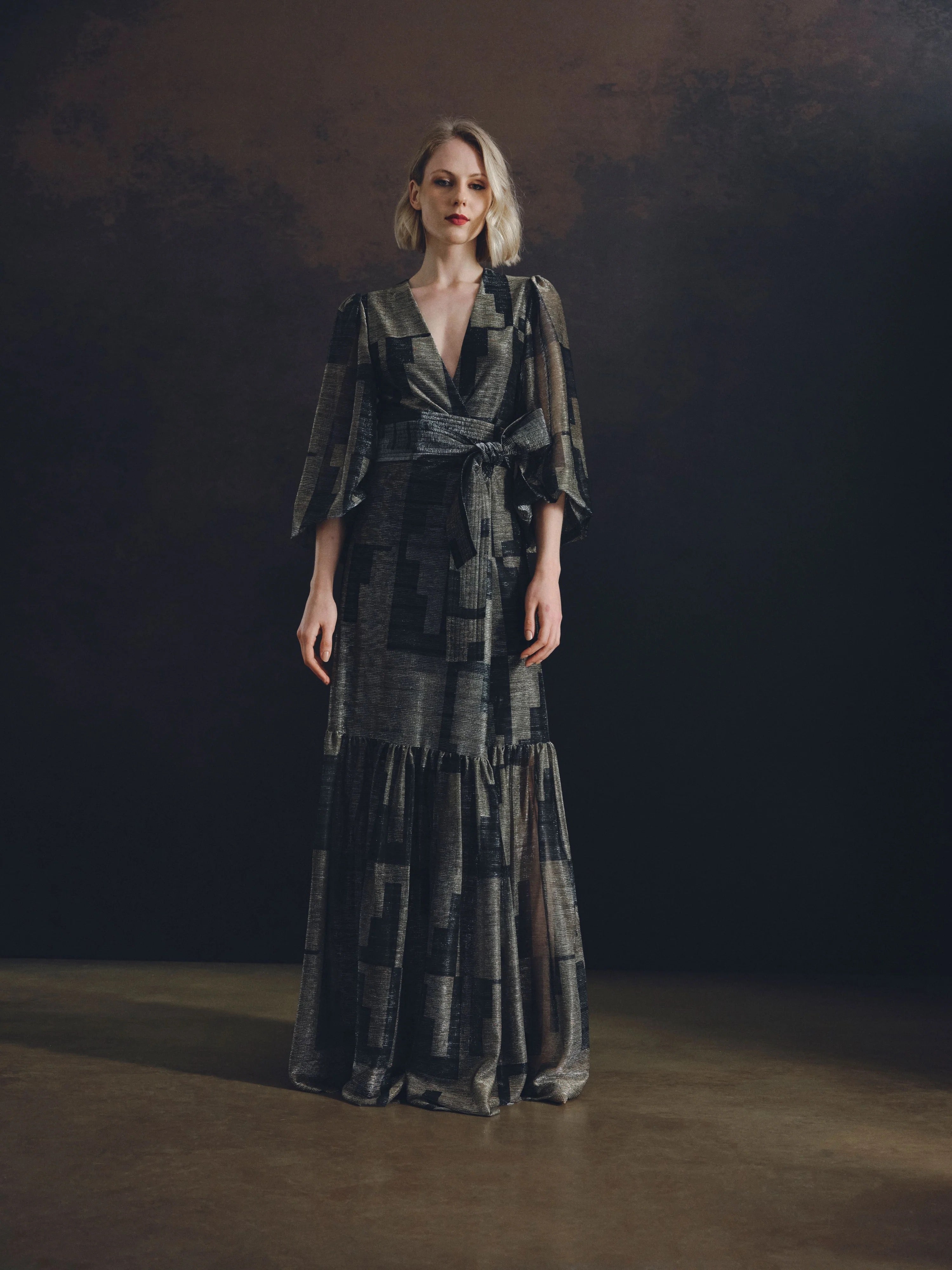 ETHEREAL BEAUTY. MAXI WRAP DRESS WITH BUTTONS AND LONG BISHOP SLEEVES FEATURING NARROW CUFFS, A PLUNGING V NECKLINE, AND A STRIKING BACKLINE. DELICATELY TRANSLUCENT WITH THE SUBTLE SHEEN OF METALLIC TULLE, SHOWCASING OUR BOLD MAXI STAIRS PRINT IN A RADIANT GOLDEN HUE.