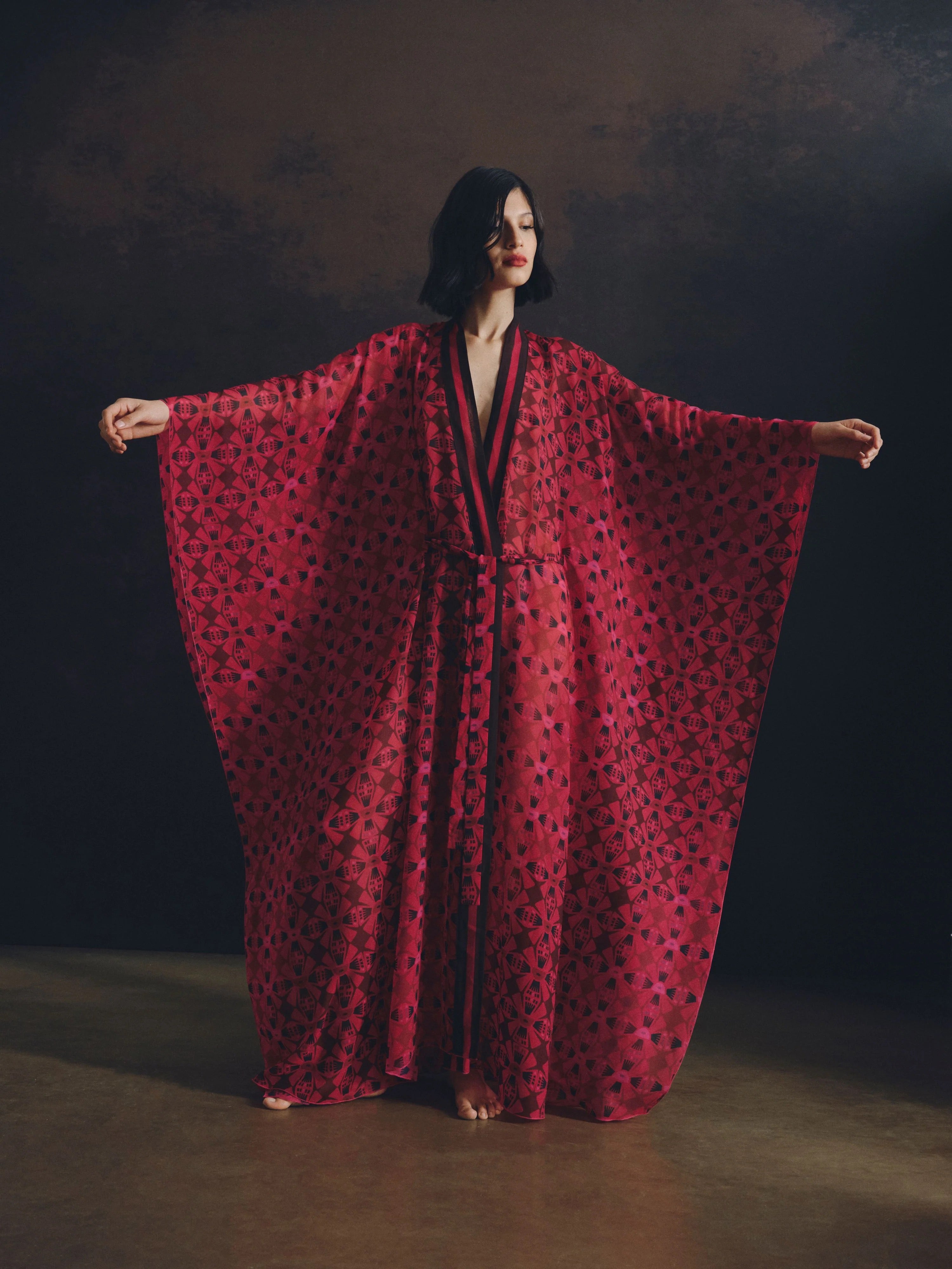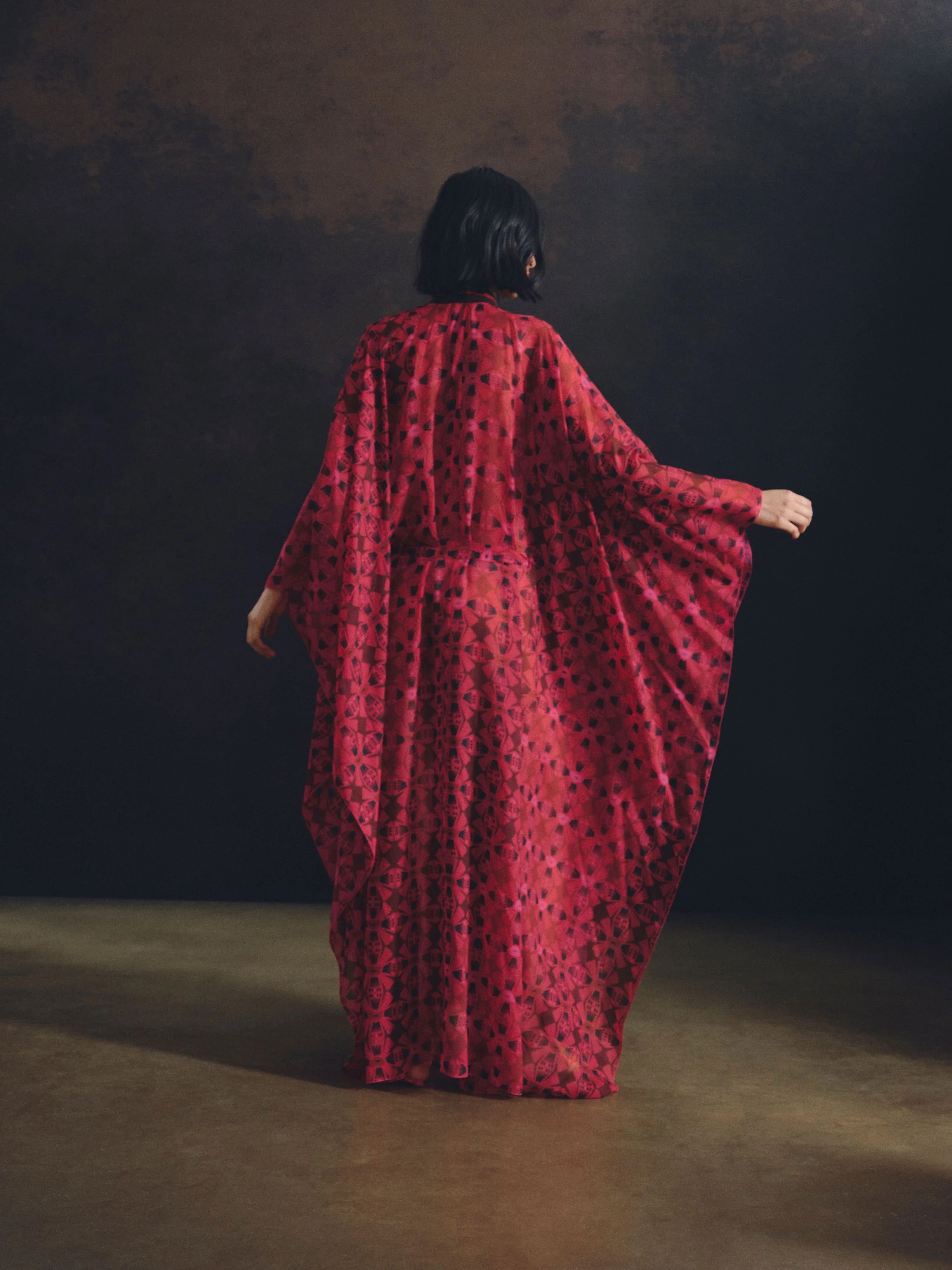 OUR SIGNATURE LONG ROBE WITH FLOWY KIMONO SLEEVES AND A REMOVABLE WAIST TIE, DESIGNED IN OUR INTI PRINT ON VIBRANT FUCHSIA GAUZE