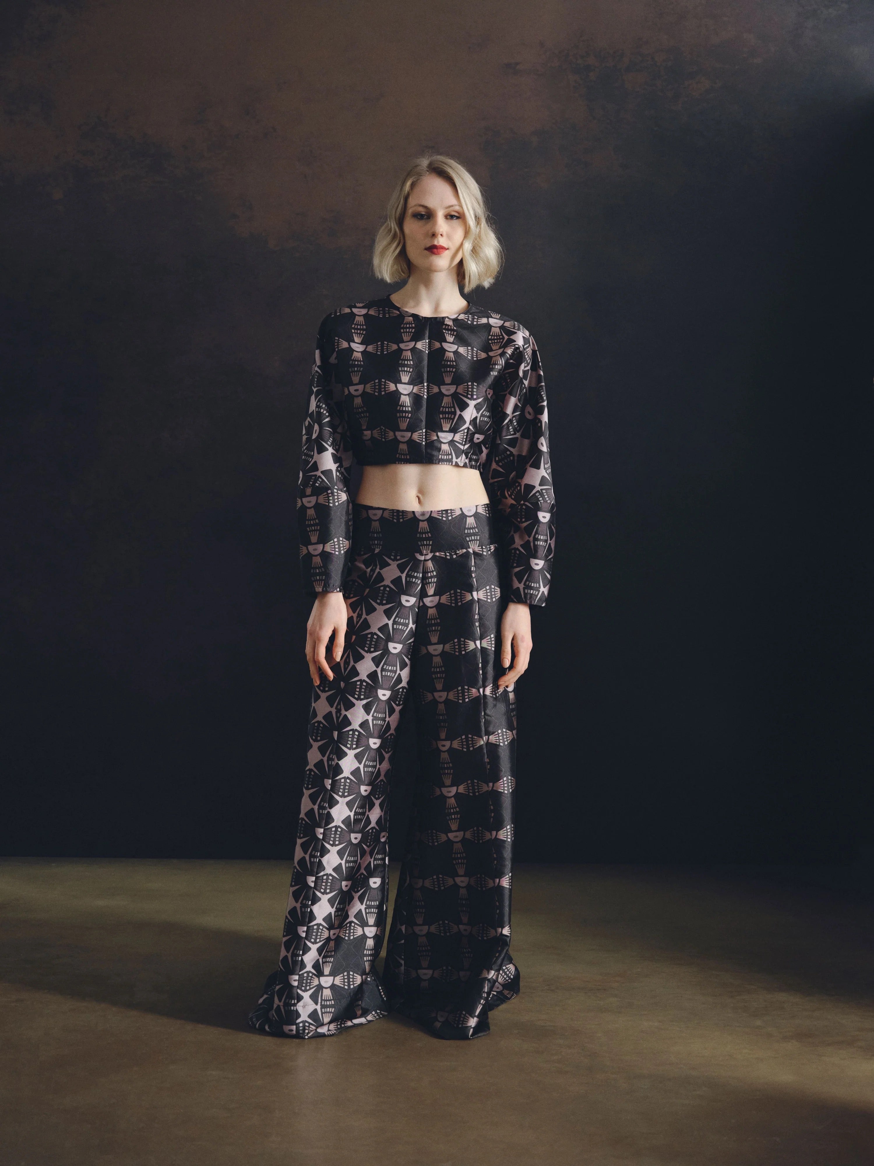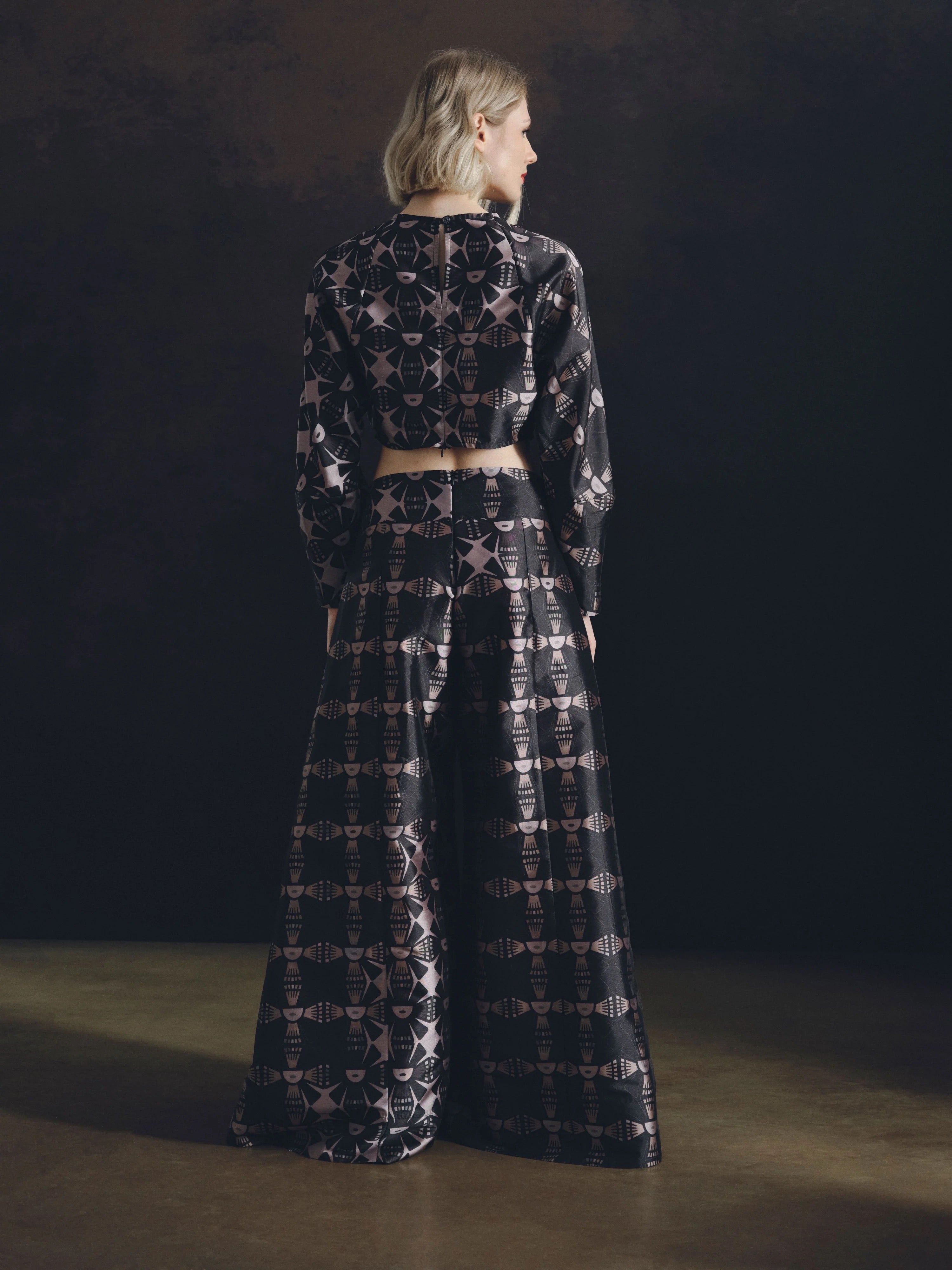 LITTLE THING. LONG-SLEEVED CROP TOP WITH PLAYFUL VOLUME IN THE ARMS AND LOW PEGS FOR A PERFECT FIT. FEATURES A BACK ZIPPER AND UPPER BUTTON, CRAFTED IN OUR INTI PRINT ON MAUVE TAFFETA.