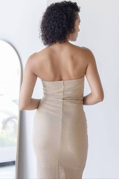 Just add slides or mules and you are good to go. Introducing the Kasandra Midi Dress by ASTR, a stunning beige dress perfect for a chic dinner party or New Year’s Eve celebration. This strapless, bodycon dress features an open knit design with a mid-thigh lining and a sheer hem, adorned with an S-bar detail at the center bust and large decorative beads. It’s crafted from a blend of 90% Polyester and 10% Elastane, ensuring a flexible yet form-fitting silhouette. Closure: Pull on style, Care: Hand wash cold, do not bleach, iron low if needed, and line dry.