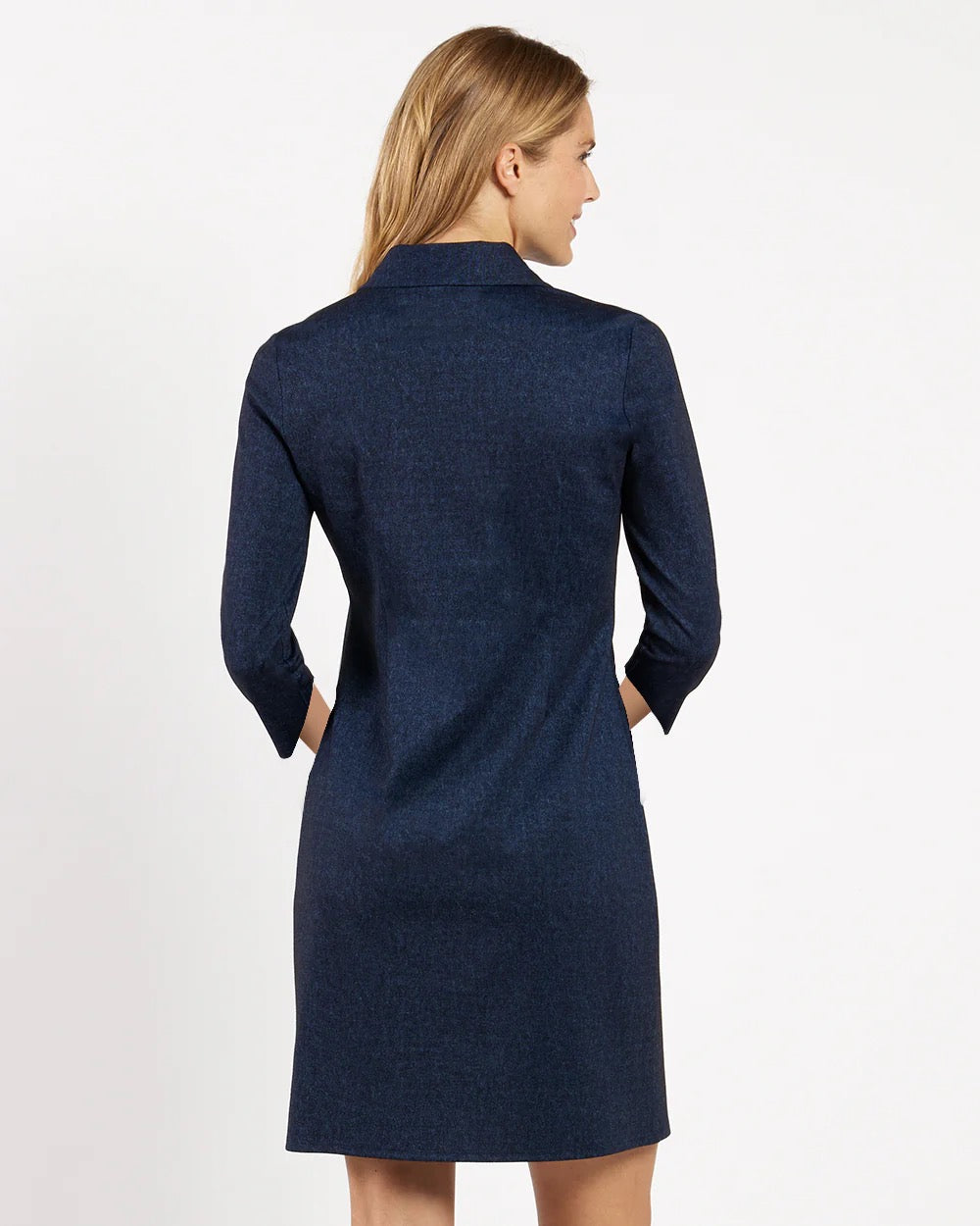 Introducing Midge! Sophisticated and timeless, this new sheath-style dress features a classic point collar and 3/4 sleeves for a refined silhouette. Gold button detailing adds a touch of elegance, making it a beautiful wardrobe staple that you can wear all year round.