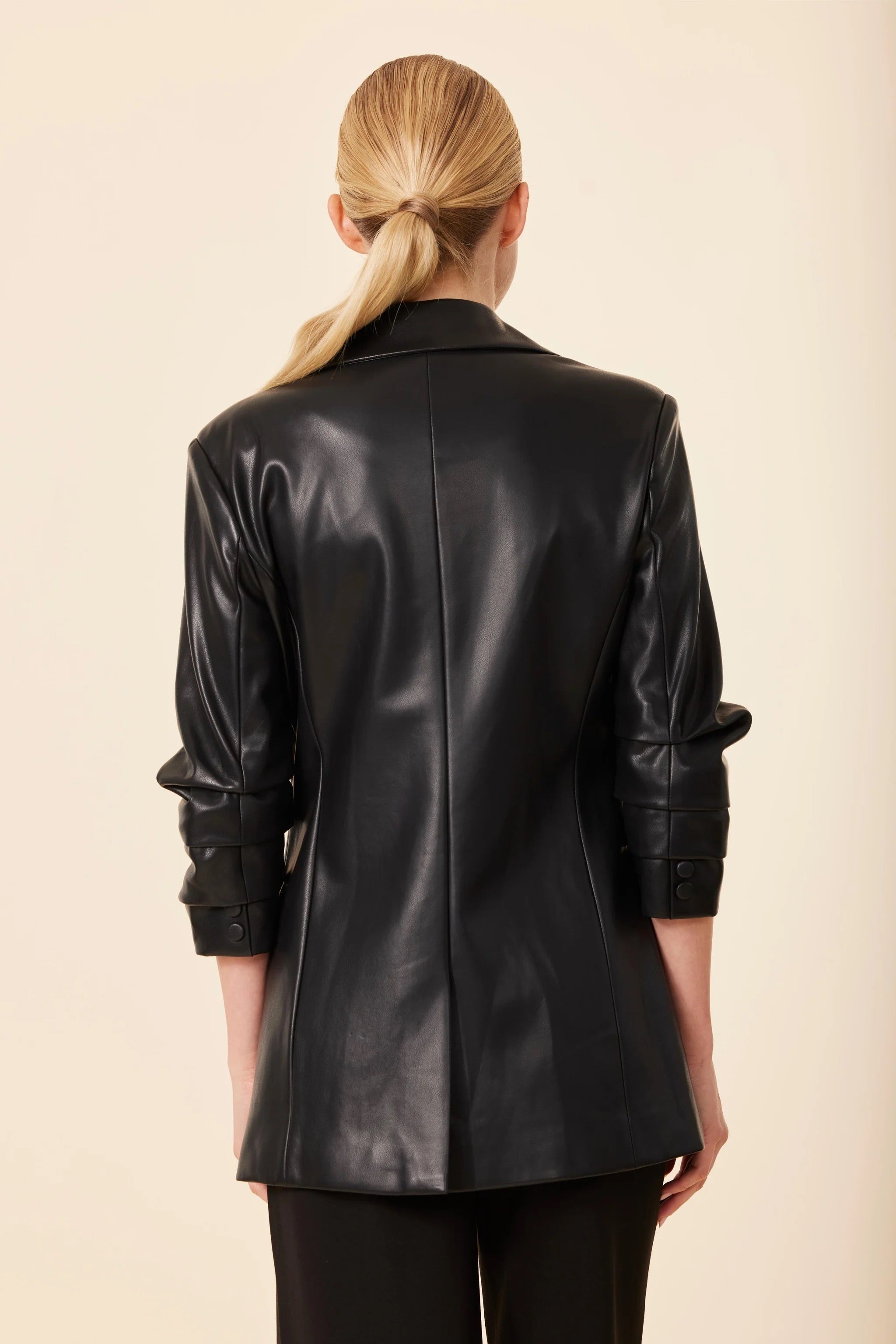 Make a bold statement with our faux leather blazer, featuring a tailored fit, notched lapels, and a single-button closure. Designed with sleek front pockets and ruched sleeves, this versatile jacket is perfect for adding modern sophistication to women’s fashion. Pair it with trousers, skirts, or dresses for a polished seasonal look.