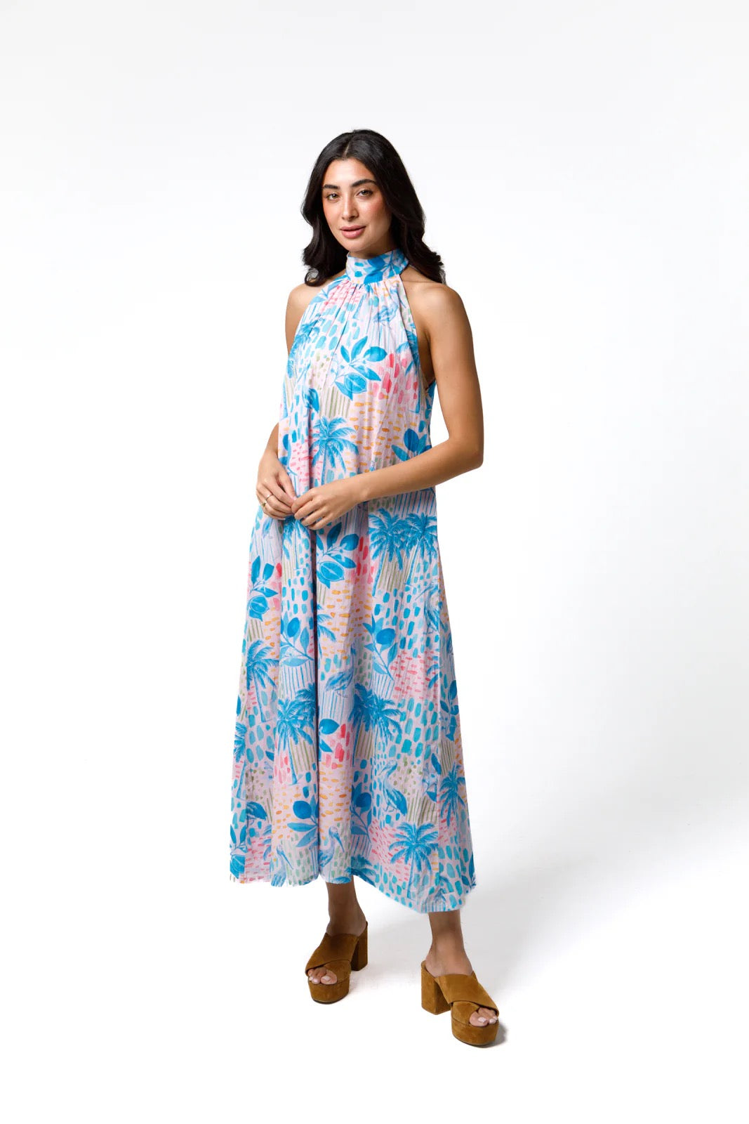 If you are in need of the PERFECT dress for weddings, vacations, hosting...this is it! The Blythe features a mock neck, tie back, dramatic maxi length and halter. This is a very flattering piece that is sure to turn heads!